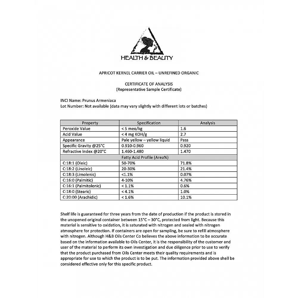 Shelf Life: Apricot Oil is slow to go rancid; users can expect a shelf life of 1 Year with proper storage conditions (cool, out of direct sunlight). Refrigeration after opening is recommended.