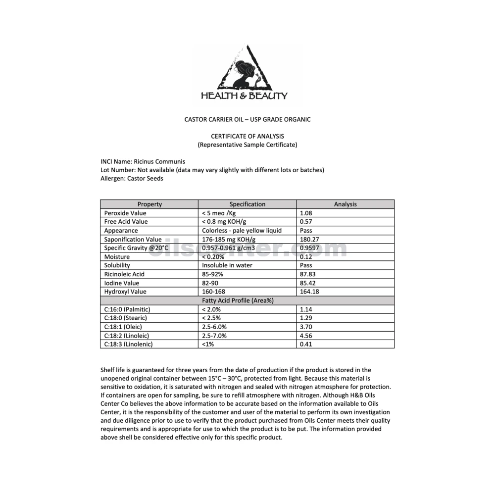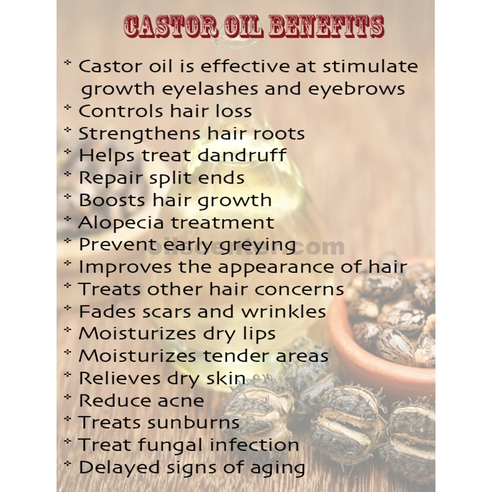 Botanical Name: Ricinus Communis. Extraction Method: Cold Pressed. Obtained From: Seeds. Organic: Made without pesticides, GMO's, or hexane. Ingredients: Castor Oil, 100% Pure with NO additives or carriers added. Description: Castor Carrier Oil is one of the few oils that can be used as an emulsifying agent. It also acts as a protective barrier on your skin that will protect against harsh environmental conditions. Color: Pale yellow to golden yellow liquid. Aromatic Description: Castor Carrier Oil has very little scent characteristic of most carrier oils. Common Uses: Castor Carrier Oil is used in massage therapy, aromatherapy, and in manufacturing (particularly as a conditioning agent in hair care products). Castor oil has many properties that make it perfect for use in cosmetics. Grabbing moisture from the air and holding it close to the skin is one such use. Cosmetic manufacturers use castor oil as a humectant to keep moisture close to the skin’s surface due to its water-binding abilities. In certain cosmetic products, castor oil actually thickens the mixture allowing the ingredients to remain more stable. In soapmaking, although castor oil would appear to require less sodium hydroxide, it sometimes requires more due to its high ricinoleic acid content. The gentleness of castor oil is another welcome characteristic. Unlike number synthetic ingredients that irritate or cause inflammation of the skin, castor oil is considered gentle. Skin irritations or allergic reactions do not often occur with the use of castor oil which makes it a prime choice for makers of cosmetics. Castor oil provides quality protection for your skin to keep it healthy. Consistency: Typical and Characteristic of Carrier Oils. Absorption: By design, Castor Oil will remain on the surface of the skin, acting as a barrier. We are buying our product from organic certified supplier, made with organic ingredients. Shelf Life: Users can expect a shelf life of 1 year with proper storage conditions (cool, out of direct sunlight). Refrigeration after opening is recommended.