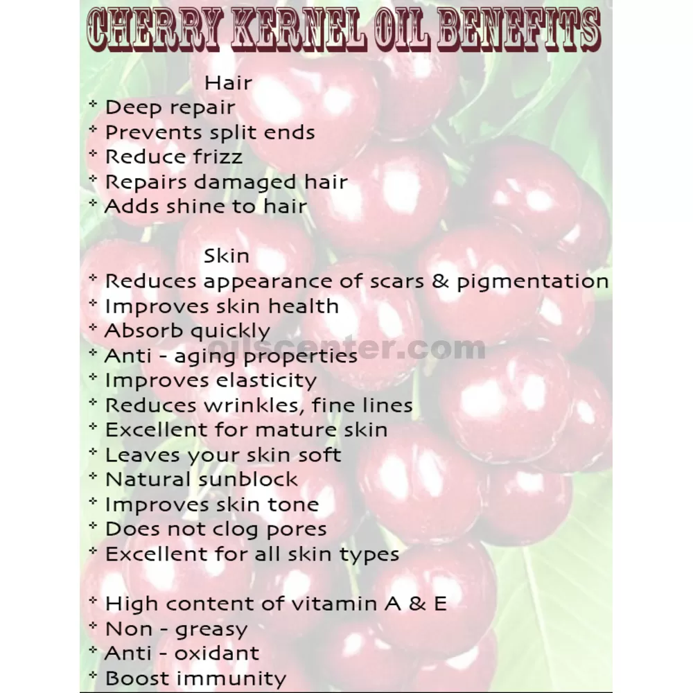 CHERRY KERNEL CARRIER OIL UNREFINEDVIRGIN ORGANIC COLD PRESSED 100% PUREBotanical Name: Prunus Avium. Extraction Method: Cold Pressed. Processing Type: Unrefined. Obtained From: Kernels. Ingredients: Cherry kernel oil, 100% Pure with NO additives or carriers added. Description: Cherry Kernel Carrier Oil contains natural antioxidants, alpha, delta and gamma tocopherols plus vitamins A & E. It also contains a polyunsaturated fatty acid called eleostearic, a conjugated linolenic acid that prevents UV absorption by forming a barrier on the surface of the skin or hair. Color: Yellow to golden yellow liquid. Aromatic Description: Cherry Kernel Carrier Oil has a characteristic cherry aroma. Common Uses: Cherry Kernel Carrier Oil is a stable, emollient oil great for skin care products and soap making. It can be used as a light, moisturizing oil for lip balms, body butters, salt and sugar scrubs, bath or massage oils as well as soaps and shampoos. It is used in aromatherapy and by massage therapists. Consistency: Typical and Characteristic of Carrier Oils. Absorption: Absorbs into skin at average speed, slight oil feeling left on skin. We are buying our products for organic certified supplier, made with organic ingredients. Shelf Life: Users can expect a shelf life of 2 years with proper storage conditions (cool, out of direct sunlight). Refrigeration after opening is recommended. |