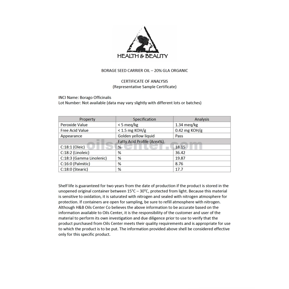 Descripción: el aceite portador de borraja es bien conocido como una de las fuentes más ricas de ácidos grasos esenciales conocidos por el hombre. Es la fuente más rica de ácido gamma linolénico (GLA), hasta un 25%. Esto ayuda a fomentar las articulaciones y tejidos móviles. También es una fuente fantástica de vitaminas y minerales. Los usuarios pueden aplicarlo tanto en la piel quemada por el sol como en la edad, aunque debido al precio y a los residuos aceitosos, muchos lo usarán en dilución con otros aceites portadores.