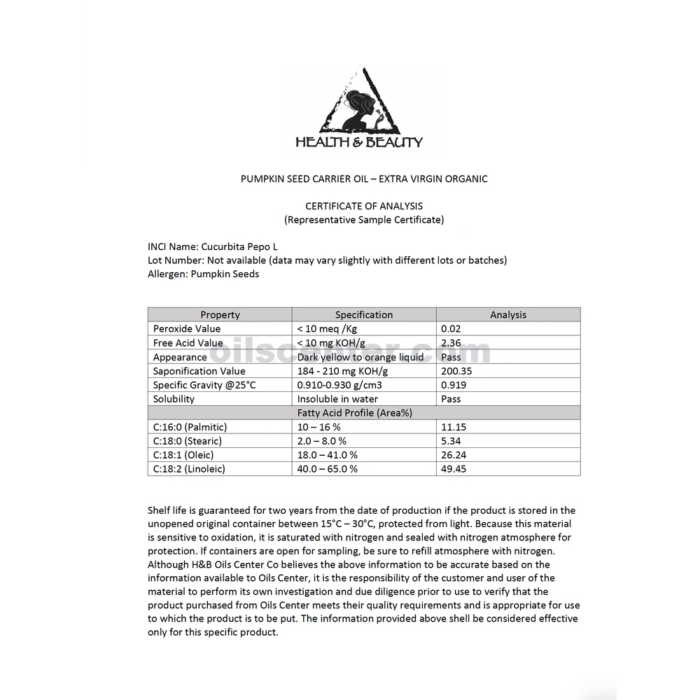 ACEITE DE SEMILLA DE CALABAZA, ORGÁNICO, PRENSADO EN FRÍO, SIN REFINAR, PURO ESTE ACEITE APTO PARA FINES COSMÉTICOS Nombre botánico: Cucurbita Pepo L. Método de extracción: prensado en frío. Tipo de procesamiento: Sin refinar. Obtenido de: Semillas. Orgánico : Hecho sin pesticidas, OGM o hexano. Ingredientes: Aceite de semilla de calabaza, 100% puro sin aditivos ni portadores añadidos. Descripción: se dice que el Aceite de semilla de calabaza orgánico es rico en vitaminas A, B, D y E; minerales y proteínas. Tiene más del 60% de ácidos grasos insaturados y es rico en ácidos grasos omega 3 y omega 6, por lo que es perfecto para la fabricación de cosméticos. Color: Líquido amarillo verde oscuro. Descripción aromática: el aceite portador de semillas de calabaza tiene un aroma atractivo a nuez tostada. Usos comunes: El aceite orgánico de semilla de calabaza tiene buenas propiedades hidratantes y lubricantes, y puede usarse en todo tipo de piel y es especialmente bueno para combatir las líneas finas y la pérdida de humedad. Debido a su alto contenido de vitaminas y minerales, el aceite de semilla de calabaza se considera extremadamente nutritivo y se puede agregar a las cremas faciales, lociones, aceites de baño, aceites de masaje, jabones y para mejorar la salud y la apariencia de la piel. El aceite de semilla de calabaza tiene un sabor agradable y suave que lo hace adecuado para aplicaciones culinarias. Debido a sus abundantes beneficios para la salud y la epidermis, recomendamos incorporar este aceite en sus recetas culinarias y cosméticas. Consistencia: Típico y característico de los aceites portadores. Absorción: el aceite orgánico de semilla de calabaza se absorbe fácilmente por la piel. Estamos comprando nuestro producto a un proveedor certificado orgánico, hecho con ingredientes orgánicos. Vida útil: los usuarios pueden esperar una vida útil de 1 año con condiciones de almacenamiento adecuadas (fresco, fuera de la luz solar directa). Se recomienda la refrigeración después de la apertura.