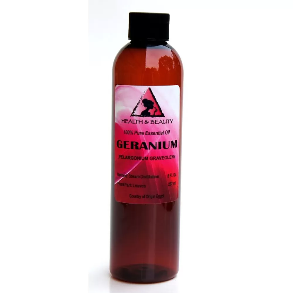 Aceite esencial de aromaterapia 100% puro de geranioNombre botánico: Pelargonium Graveolens Parte de la planta: Hojas Método de extracción: Vapor destilado Origen: Egipto Paquete / Formulario: 0.6 oz - 2.2 oz: Botella de vidrio ámbar con cuentagotas o tapa fenólica. 4 oz - 16 oz: botella de plástico ámbar. Aroma aromático: el aceite esencial egipcio de geranio tiene un aroma dulce y herbáceo, mientras que tiene algunas notas sutiles de carácter similar al de Rose. Fuerza del aroma: Fuerte Combina bien con: albahaca, bergamota, citronela, salvia, hinojo, toronja, jazmín, enebro, lavanda, limón, hierba de limón, neroli y nuez moscada. Usos comunes: El aceite esencial egipcio de geranio es conocido por sus propiedades para el cuidado de la piel. Se puede usar para igualar las pieles grasas o mixtas y se dice que nutre y rehidrata la piel seca y madura. El geranio egipcio también se puede usar para calmar la irritabilidad, relajar la mente y aliviar los casos de insomnio. El fuerte olor de este aceite es particularmente bueno para evitar los mosquitos y los piojos. Propiedades : Analgésico, antibacteriano, antidepresivo, antidiabético, antiinflamatorio, antiséptico, astringente, cicatrizante, desodorante, diurético, emenagogo, hepático, insecticida, regenerativo, rubefaciente, sedante, estético, tónico, vasoconstrictor, vermifuge, vulnerary. Beneficios: Ansiedad, capilares rotos, hematomas, quemaduras, trastornos circulatorios, cortes, diarrea, retención de líquidos, picaduras de insectos, congestión linfática, dolor de garganta, estabilizar emociones, úlceras, heridas. Las propiedades estabilizadoras emocionales de este aceite se pueden usar de muchas maneras. Difúndalo en el aire, o haga un spray de habitación que pueda rociar según sea necesario. También puede agregar un par de gotas a un baño relajante. Historia: Hay más de 200 especies de geranios, algunos perfumados y otros no. Las plantas se originaron en Sudáfrica, así como en Reunión, Madagascar, Egipto y Marruecos. Fueron introducidos en países europeos como Italia, España y Francia en el siglo XVII. En los primeros tiempos se plantaron geranios alrededor de la casa para ayudar a mantener a raya a los espíritus malignos. Vida útil y almacenamiento desde el momento de la destilación : Aproximadamente 4 - 5 años. Es imposible decir exactamente cuál será la vida útil de un aceite esencial. Las condiciones de almacenamiento variarán y marcarán una diferencia significativa. Si el aceite esencial se recibió directamente del destilador poco después de la destilación y la botella de vidrio se mantiene oscura, llena, cerrada y fresca, podemos hacer algunas generalizaciones. Tenga en cuenta que si un aceite esencial comienza a aparecer turbio, más espeso o si huele más ácido, es probable que haya comenzado a oxidarse. Precauciones: El aceite de geranio no es tóxico, no irrita y, en general, no sensibiliza. Puede causar sensibilidad en algunas personas y, debido al hecho de que equilibra el sistema hormonal, debe evitarse durante el embarazo.
